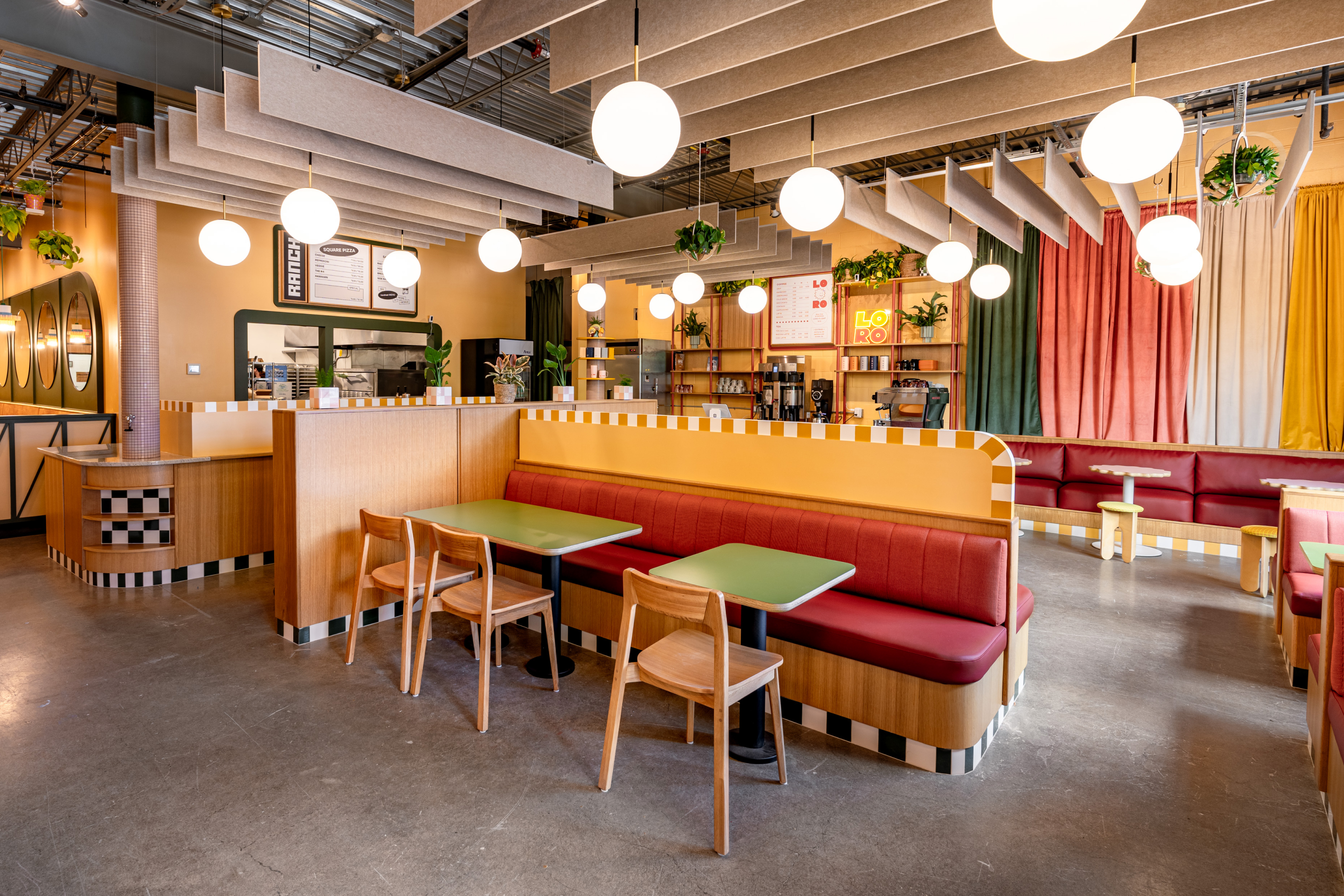The previous Ranch locations have a playful aesthetic, a bit referential of 80s arcade interiors, while the visual identity we created for LoRo has a sunny disposition. We saw an opportunity to elevate the interiors of this new space while maintaining the fun and laid-back quality that both brands embody. The resulting interiors have a decidedly modern feeling that leans futuristic without losing that familiar feeling of the classic pizza shops we know and love.