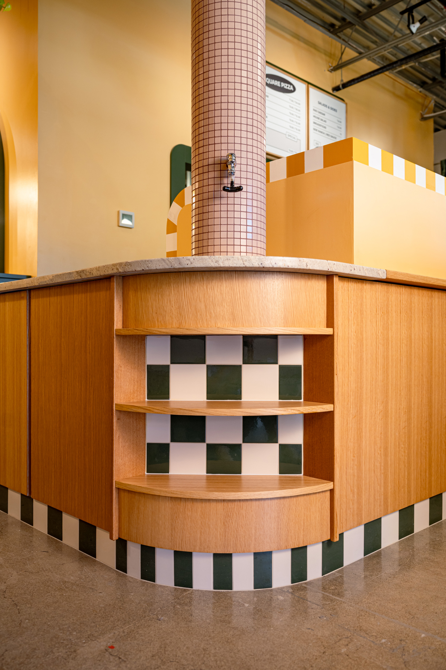 The tile story was developed as a nod to 80s arcade pizza joints and Ranch’s famously square pizza. We carried this motif throughout the space, including outside with a tile mosaic sign.